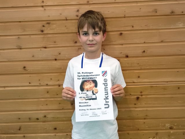 Am 18.10.2025 fand das 36. Peitinger Spitzbubenturnier statt. Unser Kämpfer Max startete in der Altersklasse U14 bis 40 kg. Er konnte den ersten Kampf in seinem allerersten Turnier mit einem spektakulären Wurf vorzeitig für sich entscheiden. Im zweiten Kampf stieß er auf viel Gegenwehr, konnte aber dennoch punkten und gewann. Beim dritten und vierten Kampf bekam er es mit wesentlich erfahreneren Gegnern zu tun und musste sich leider beide Male geschlagen geben. Wir vom Trainerteam gratulieren Max ganz herzlich zu seinem Erfolg...